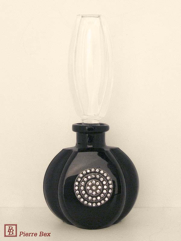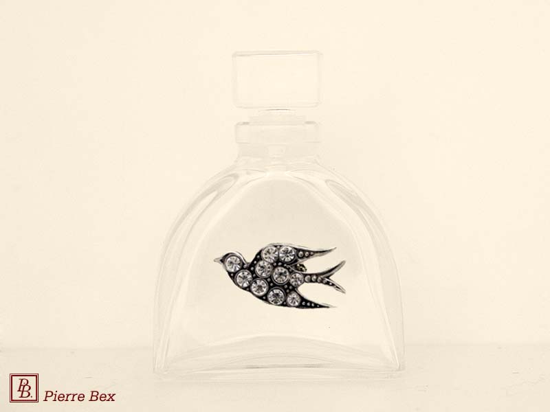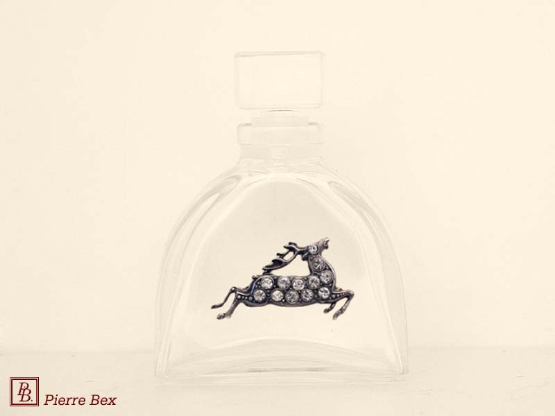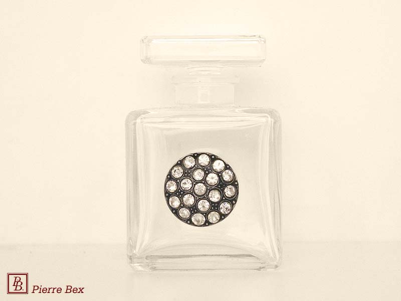 売約済みピエールベル、フランス製 Made in France by Pierre-Bex of frosted glass and silverplated copper with color crystal rhinestones, this perfume bottle is 6.5 cm height. 売約済み |