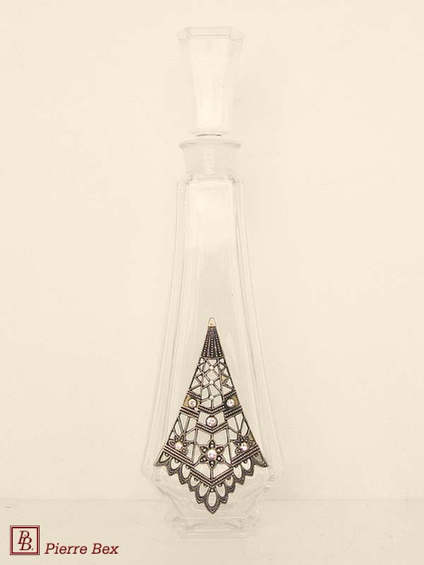 売約済みピエールベル、フランス製 Made in France by Pierre-Bex of glass and silverplated copper with crystal rhinestones, this perfume bottle is 9 cm height. 売約済み |